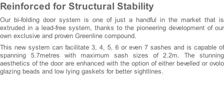 These bi-folding doors harness 5 chambered profiles for better energy efficiency when many other companies products have just 3. All profiles are fully reinforced to add structural stability, while the powder coated aluminium tracks guarantee the maximum possible service life. Like all Kommerling systems, the bi-folding door is available in a wide range of colours and woodgrains.