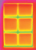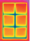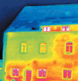 The thermal image of the house above, shows the green areas (top left) where old windows have been replaced with modern energy efficient ones, in contrast to the old existing windows shown in magenta, which let considerable heat out of the home.